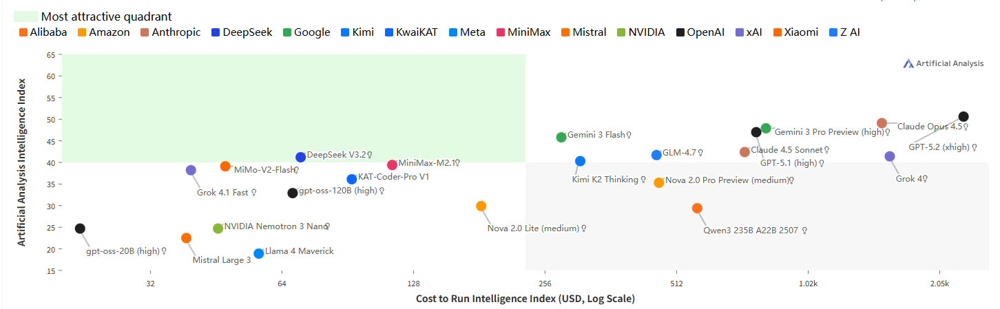 以DeepSeek、MiniMax为代表的中国开源大模型,每单位美元的智能化水平更高,比国外模型更有性价比。图片来源:Artificial Analysis