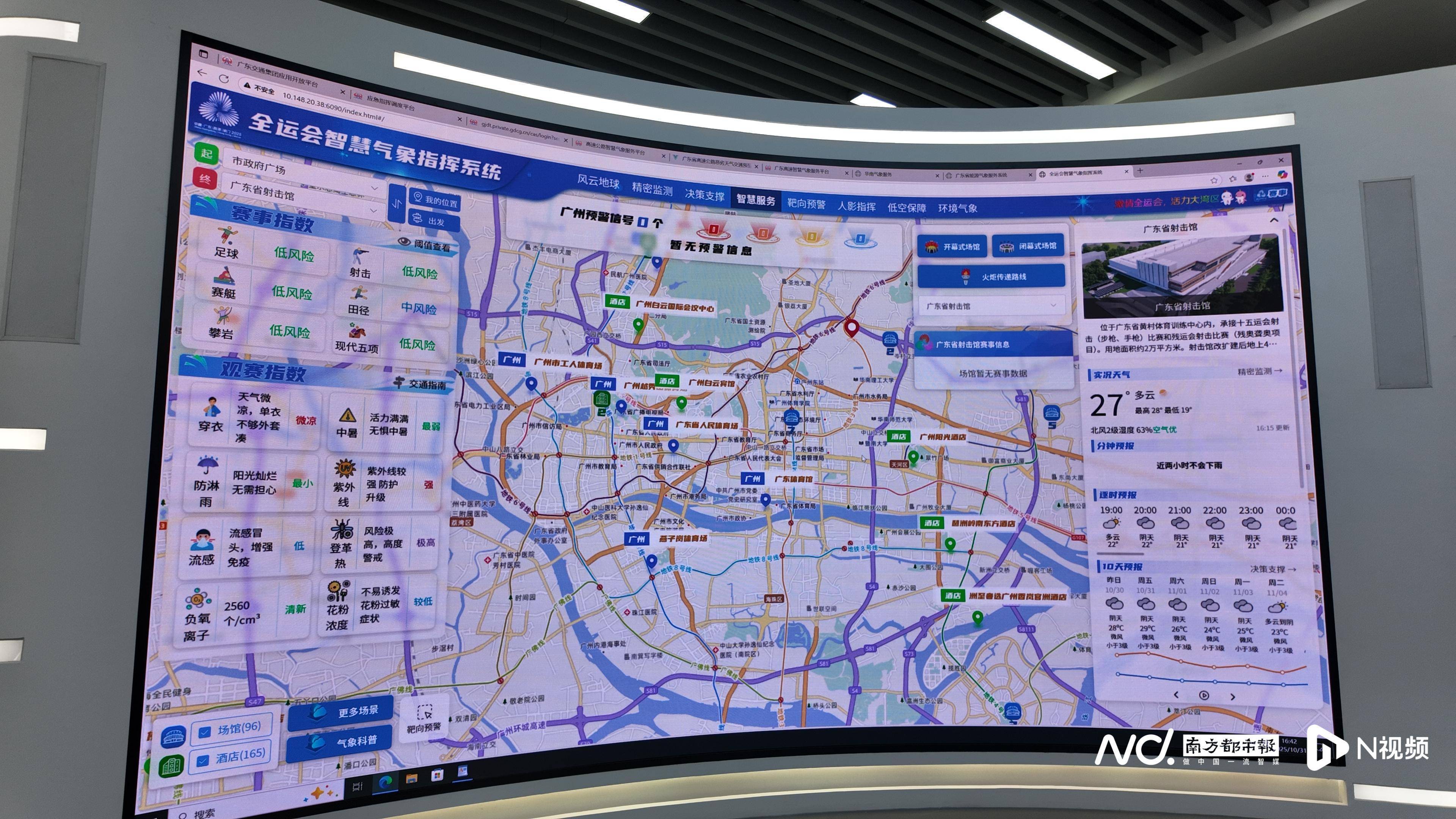 10月31日,南都记者走进广东省气象局珠江三角洲中小尺度气象灾害监测预警中心,巨大的电子屏上实时显示着“全运会智慧气象服务指挥系统”的运行情况。
