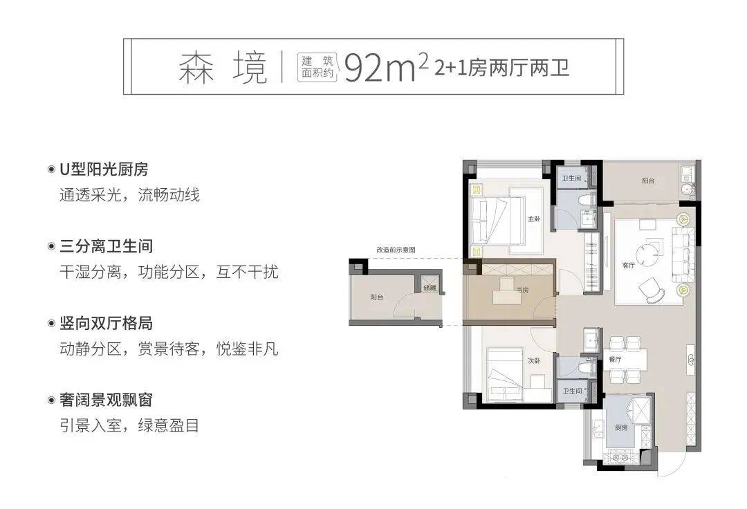 双阳台设计,实现南北对流,随时更新空气,还能提供更合理的家居功能划分,让南向景观面更纯粹。